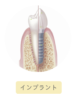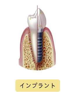 インプラントとは、顎の骨に人工歯根となる金属を埋め込み、その金属を土台にして、天然の歯と同じような人工の歯を取り付ける治療方法です。