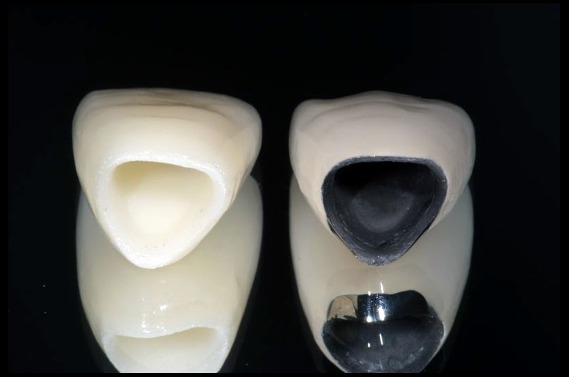 銀の土台の上に天然歯に似た色調と透明度、耐摩耗性、耐変色性に優れた陶材を溶着したもので、金属の持つ強度と陶材の持つ審美性を兼ね備えています。