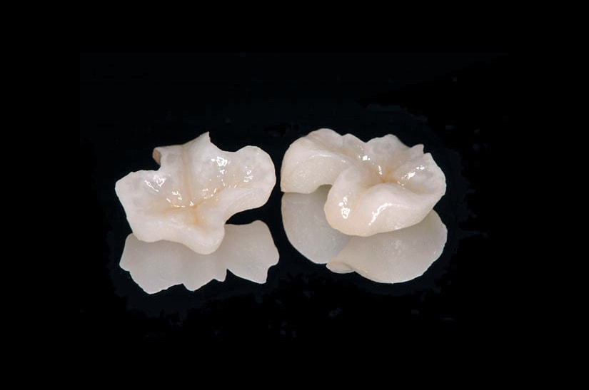 削った形に成形された天然歯に近い色調、透明度のセラミックで形成された詰め物です。