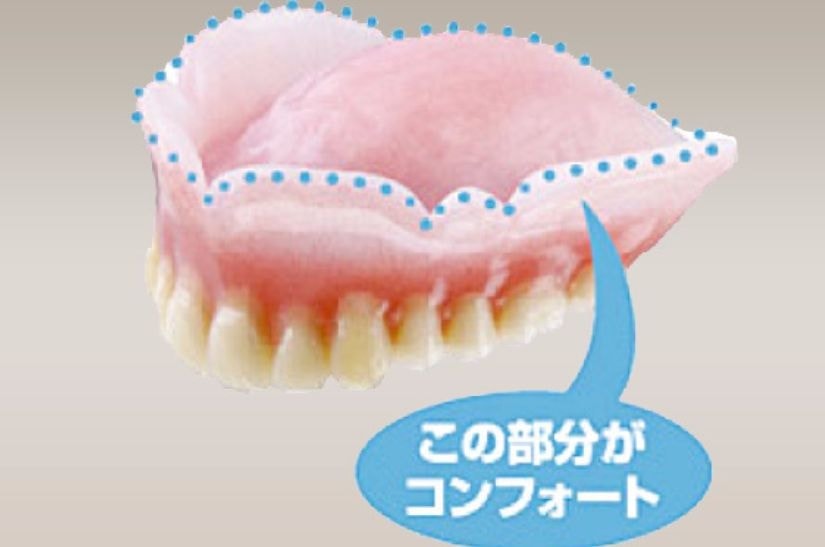 入れ歯と接する上あごや歯ぐきにかかる負担を軽減するために、生体用シリコーンというクッション性の高い素材を使った入れ歯です。