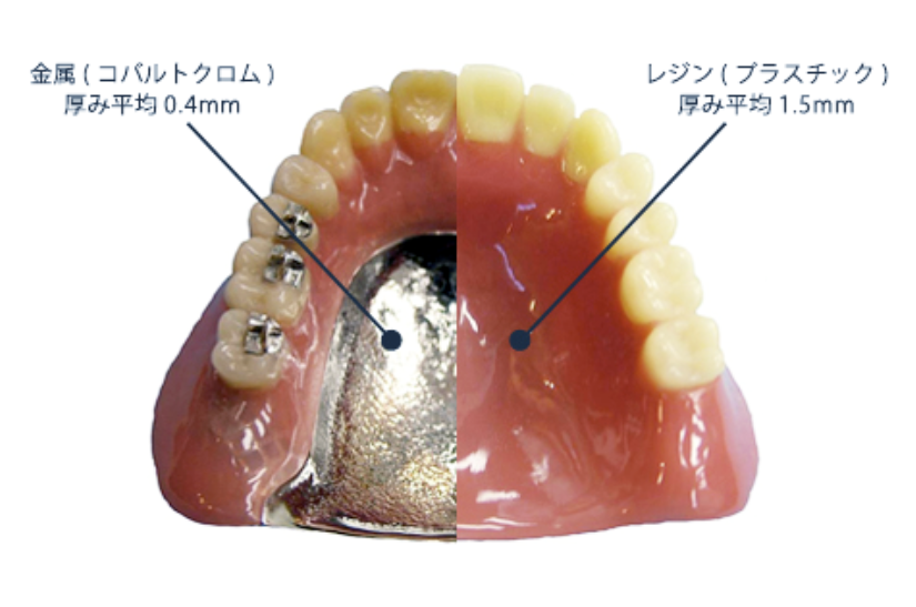 レジン床に比べ薄く作れるので装着感も良く、熱を伝えやすいので、温かいもの、冷たいものを食べたときに違和感が少なくなります。